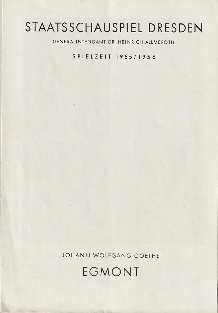 Staatsschauspiel Dresden, Heinrich Allmeroth, Ellen Barz, Gabriele Metzler: Programmheft Johann Wolfgang Goethe EGMONT Spielzeit 1955 / 56.