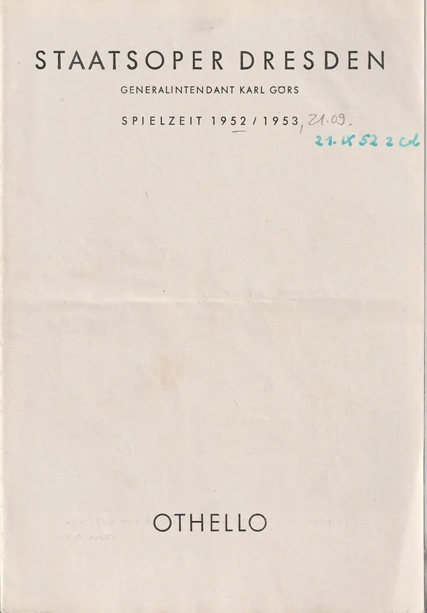 Staatsschauspiel Dresden, Karl Görs, Günter Haußwald: Programmheft Giuseppe Verdi OTHELLO 21. September 1952 Großes Haus Spielzeit 1952 / 53.