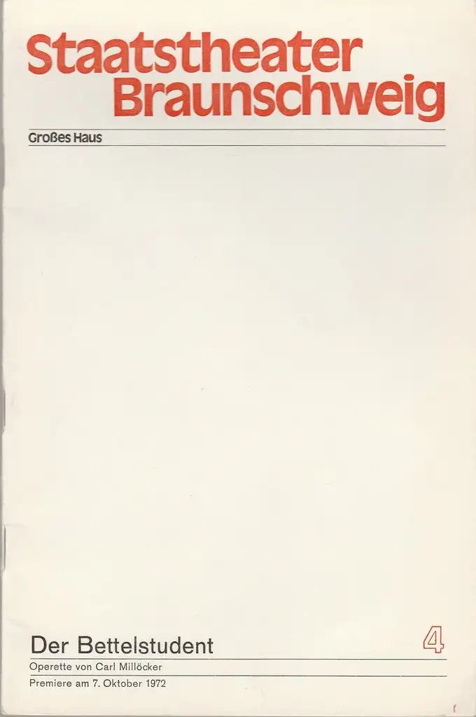 Staatstheater Braunschweig, Christoph Groszer, Helmar Harald Fischer, Ursula Siefken, Burkhard Heinrichsen, Heinz Balthes: Programmheft Carl Millöcker DER BETTELSTUDENT Premiere 7. Oktober 1972 Großes Haus Heft 4.
