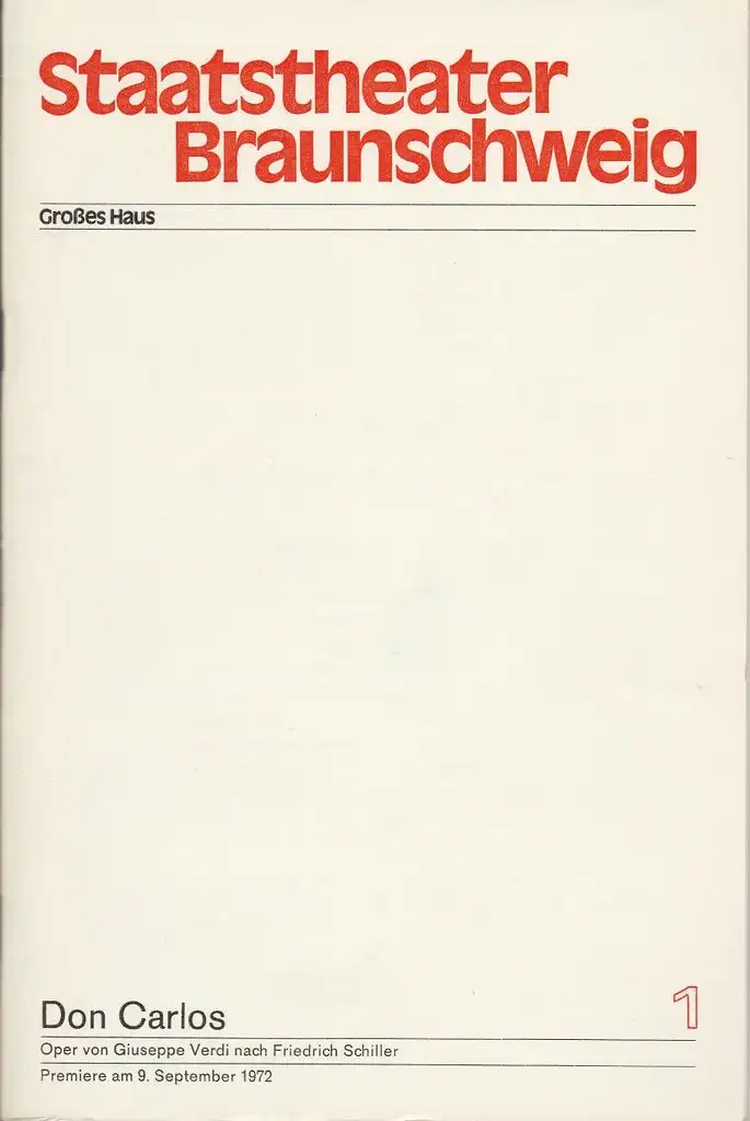 Staatstheater Braunschweig, Christoph Groszer, Helmar Harald Fischer, Ursula Siefken, Burkhard Heinrichsen: Programmheft Giuseppe Verdi DON CARLOS Premiere 9. September 1972 Großes Haus Heft 1.