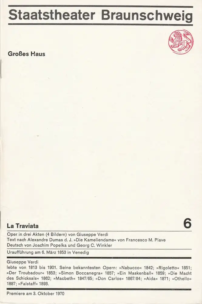 Staatstheater Braunschweig, Hans Peter Doll, Alek Pohl, Heinz H. Rosenthal, Herbert J. E. Fischer, Burkhard Heinrichsen: Programmheft Giuseppe Verdi LA TRAVIATA Premiere 3. Oktober 1970 Großes Haus Heft 6.