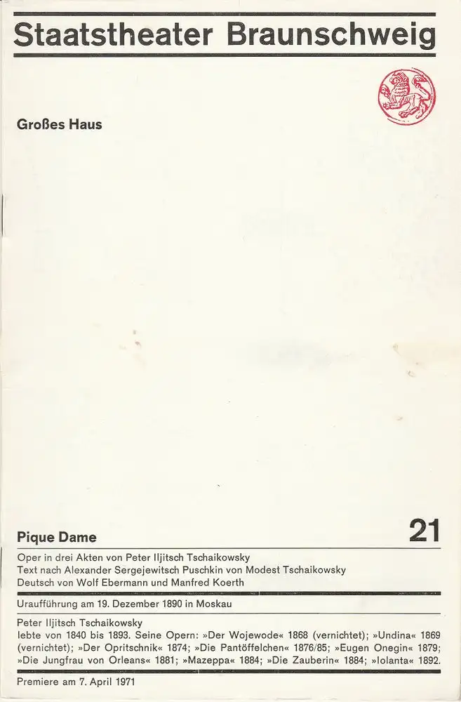 Staatstheater Braunschweig,Hans Peter Doll, Alek Pohl, Heinz H. Rosenthal, Herbert J. E. Fischer, Burkhard Heinrichsen: Programmheft Peter Iljitsch Tschaikowsky PIQUE DAME Premiere 7. April 1971 Großes Haus Heft 21.