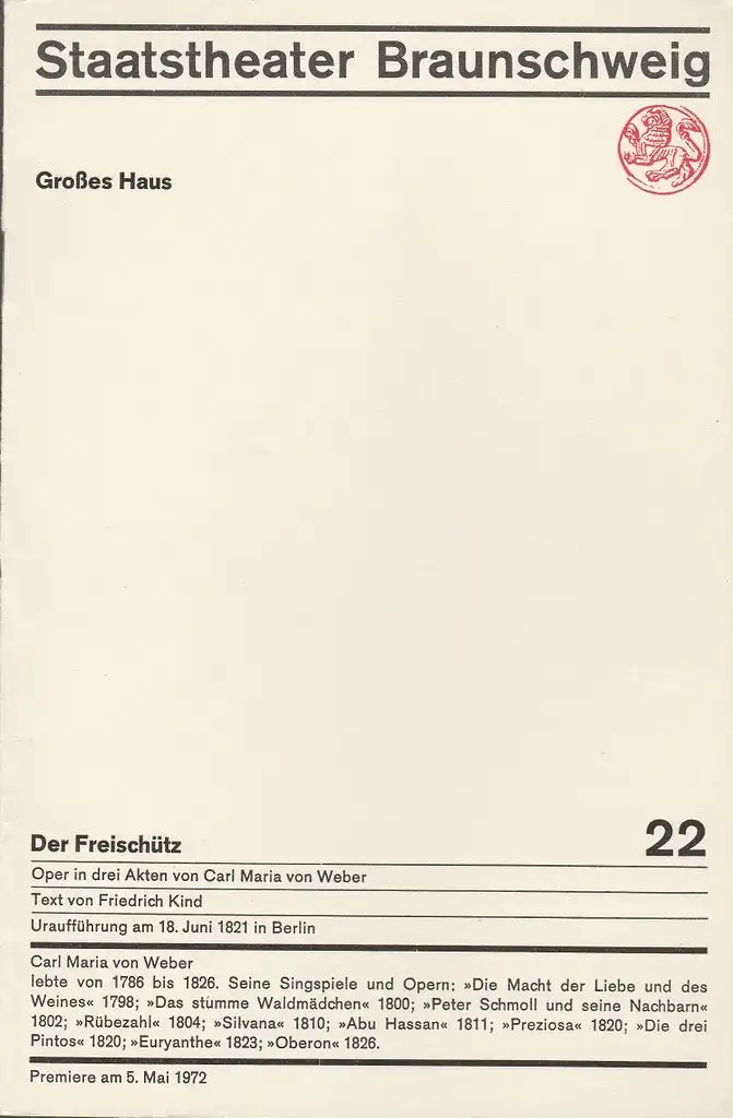 Staatstheater Braunschweig, Hans Peter Doll, Herbert J. E. Fischer, Heinz H. Rosenthal, Walter Schorlies, Burkhrad Heinrichsen: Programmheft Carl Maria von Weber DER FREISCHÜTZ Premiere 5. Mai 1972 Großes Haus Heft 22.