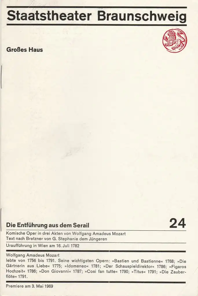 Staatstheater Braunschweig, Hans Peter Doll, Horst Statkus, Heinz H. Rosenthal, Burkhard Heinrichsen, Karl-Ernst Herrmann: Programmheft Wolfgang Amadeus Mozart DIE ENTFÜHRUNG AUS DEM SERAIL Premiere 3. Mai 1969 Großes Haus Heft 24.