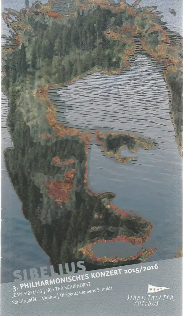 Solistin: Sophia Jaffe, Violine. Philharmonisches Orchester. Dirigent: Clemens Schuldt. Programm: JEAN SIBELIUS: Valse triste op. 44. Violinkonzert d-Moll op. 47. Sinfonie Nr. 5 op. 82. IRIS TER SCHIPHORST: Uraufführung La tristesse duera. Auftragswerk des Staatstheaters Cottbus, - Theaterprogramm, Opernprogramm, Ballettprogramm, Musicalprogramm, Konzertprogramm, Theatermemorabilia, Programmhefte Sammlung, deutsche Theatergeschichte.