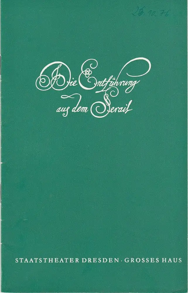 Singspiel. Musik: Wolfgang Amadeus Mozart. Musikalische Leitung: Peter Gülke. Inszenierung: Harry Kupfer. Bühne und Kostüme: Peter Sykora. Mitwirkende: Werner Haseleu, Carolyn Smith-Meyer, Barbara Sternberger, Armin Ude, Uwe Peper, Rolf Tomaszewski, Karl Oehmig - Theaterprogramm, Opernprogramm, Ballettprogramm, Musicalprogramm, Konzertprogramm, Theatermemorabilia, Programmhefte Sammlung, deutsche Theatergeschichte.