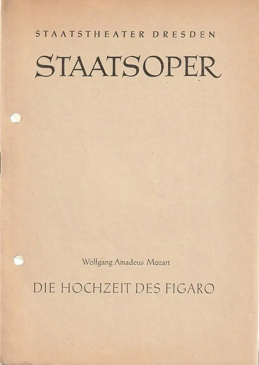 Opera buffa in vier Akten. Neu einstudiert und inszeniert. Musikalische Leitung: Otmar Suitner. Inszenierung: Erich Geiger. Bühne und Kostüme: Jochen Hasselwander. Choreographie: Tom Schilling. Mitwirkende: Hanns-Herbert Schulz, Ruth Glowa-Burkhardt, Eleonore Elstermann, Theo Adam, Gisela Schröter, Ruth Lange, Helmut Goldmann, Johannes Kemter, Wolfgang Markgraf, Egon Braunes, Renate Reinecke, Helga Köhler-Bobak, Ruth Loeltgen - Theaterprogramm, Opernprogramm, Ballettprogramm, Musicalprogramm, Konzertprogramm, Theatermemorabilia, Programmhefte Sammlung, deutsche Theatergeschichte.