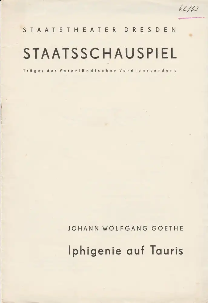Staatstheater Dresden, Staatsschauspiel, Gerd Michael Henneberg, Eberhard Sprink, Heinz Pietzsch: Programmheft IPHIGENIE AUF TAURIS. Schauspiel von Johann Wolfgang Goethe. Spielzeit 1962 / 63 Heft 6.