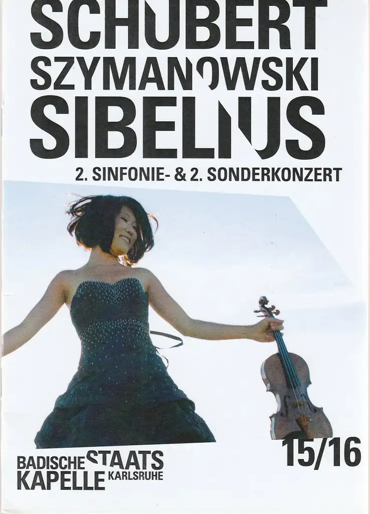 Badische Staatskapelle. Solistin: Tianwa Yang, Violine. Dirigent: Justin Brown. FRANZ SCHUBERT: Sinfonie Nr. 8 h-Moll, Unvollendete. KARO SZYMANOWSKI: Violinkonzert Nr 1 op. 35. JEAN SIBELIUS: Sinfonie Nr. 5 Es-Dur op. 82. - Theaterprogramm, Opernprogramm, Ballettprogramm, Musicalprogramm, Konzertprogramm, Theatermemorabilia, Programmhefte Sammlung, deutsche Theatergeschichte.