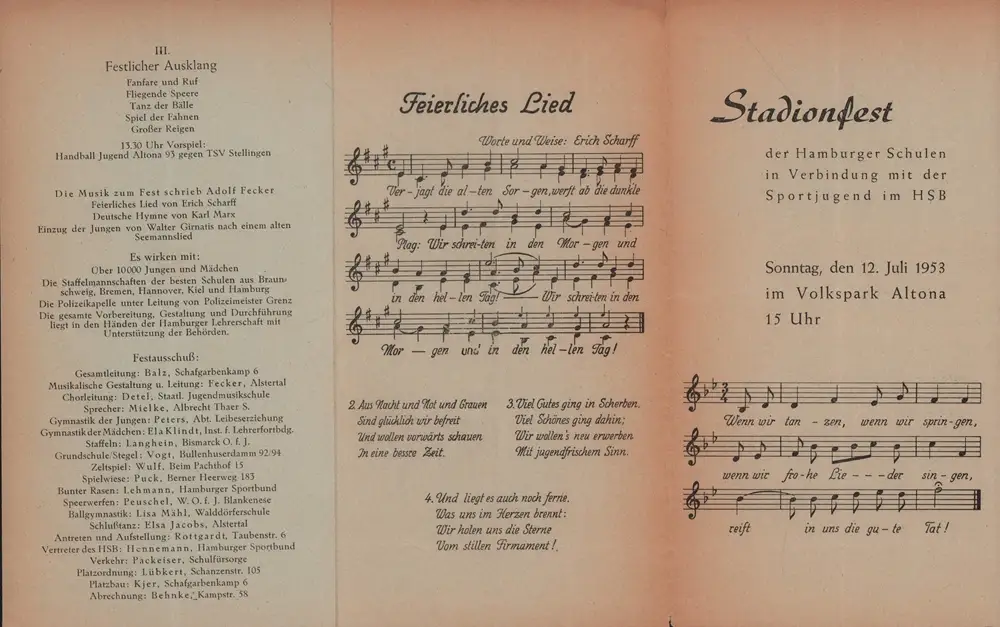 Stadionfest der Hamburger Schulen in Verbindung mit der Sportjugend im HSB. [Programmheft]. Sonntag, 12. Juli 1953 im Volkspark Altona um 15 Uhr.