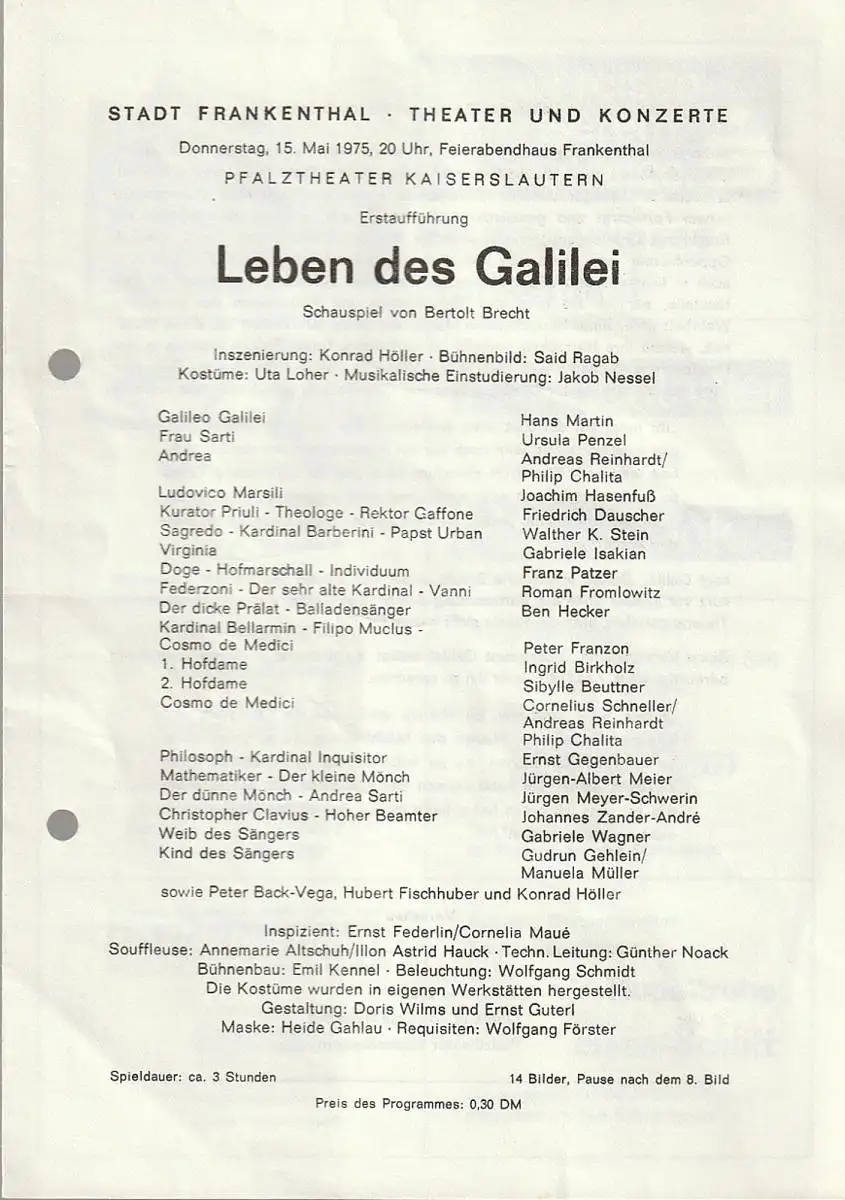 Stadt Frankenthal, Theater und Konzerte, Feierabendhaus Frankenthal: Programmheft Bertolt Brecht LEBEN DES GALILEI 15. Mai 1975.