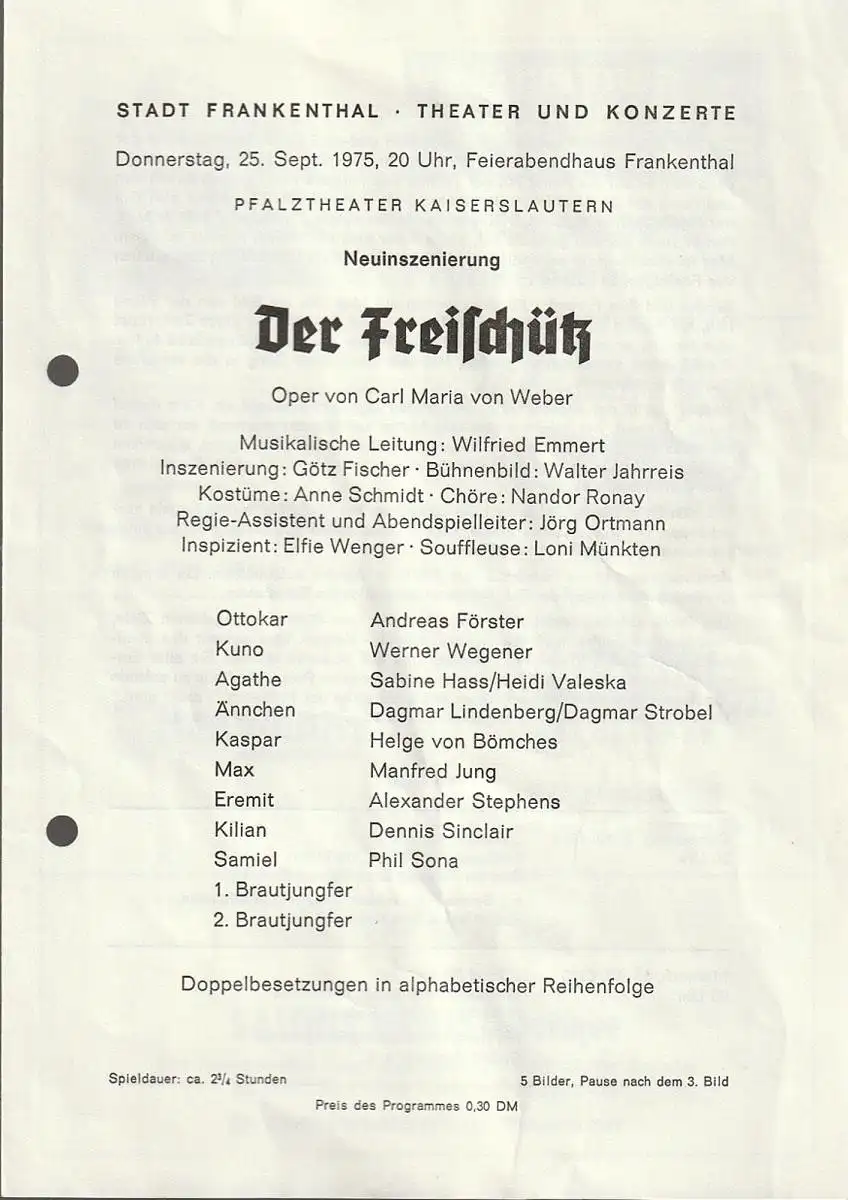 Stadt Frankenthal, Theater und Konzerte, Feierabendhaus Frankenthal: Programmheft Carl Maria von Weber DER FREISCHÜTZ 25. September 1975 Feierabendhaus Frankenthal.
