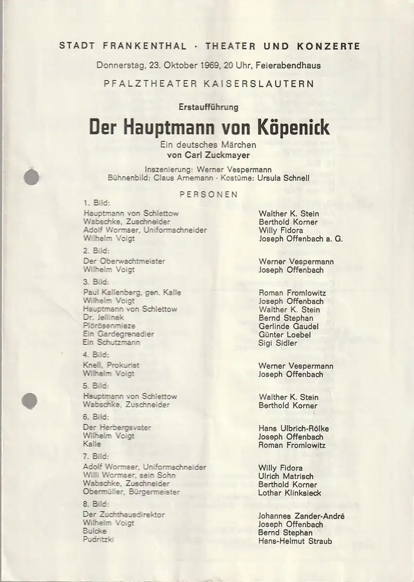 Stadt Frankenthal, Theater und Konzerte, Feierabendhaus Frankenthal: Programmheft Carl Zuckmayer DER HAUPTMANN VON KÖPENICK 23. Oktober 1969.