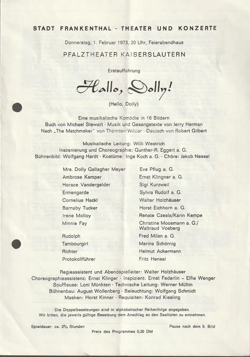 Titel: Programmheft Erstaufführung Jerry Herman Hallo, Dolly ! 1. Februar 1973 Feierabendhaus Frankenthal