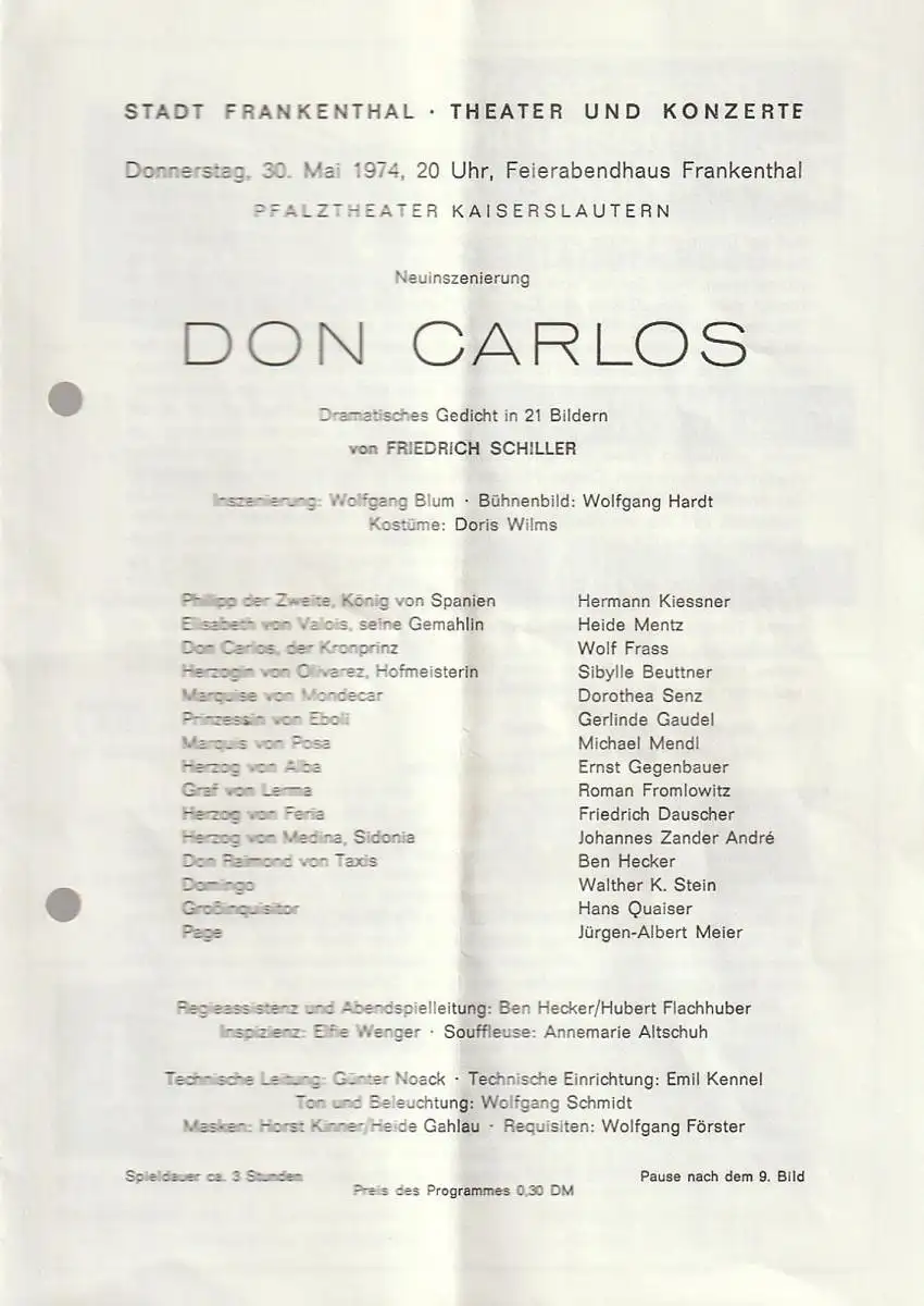Stadt Frankenthal, Theater und Konzerte, Feierabendhaus Frankenthal: Programmheft Friedrich Schiller DON CARLOS 30. Mai 1974.