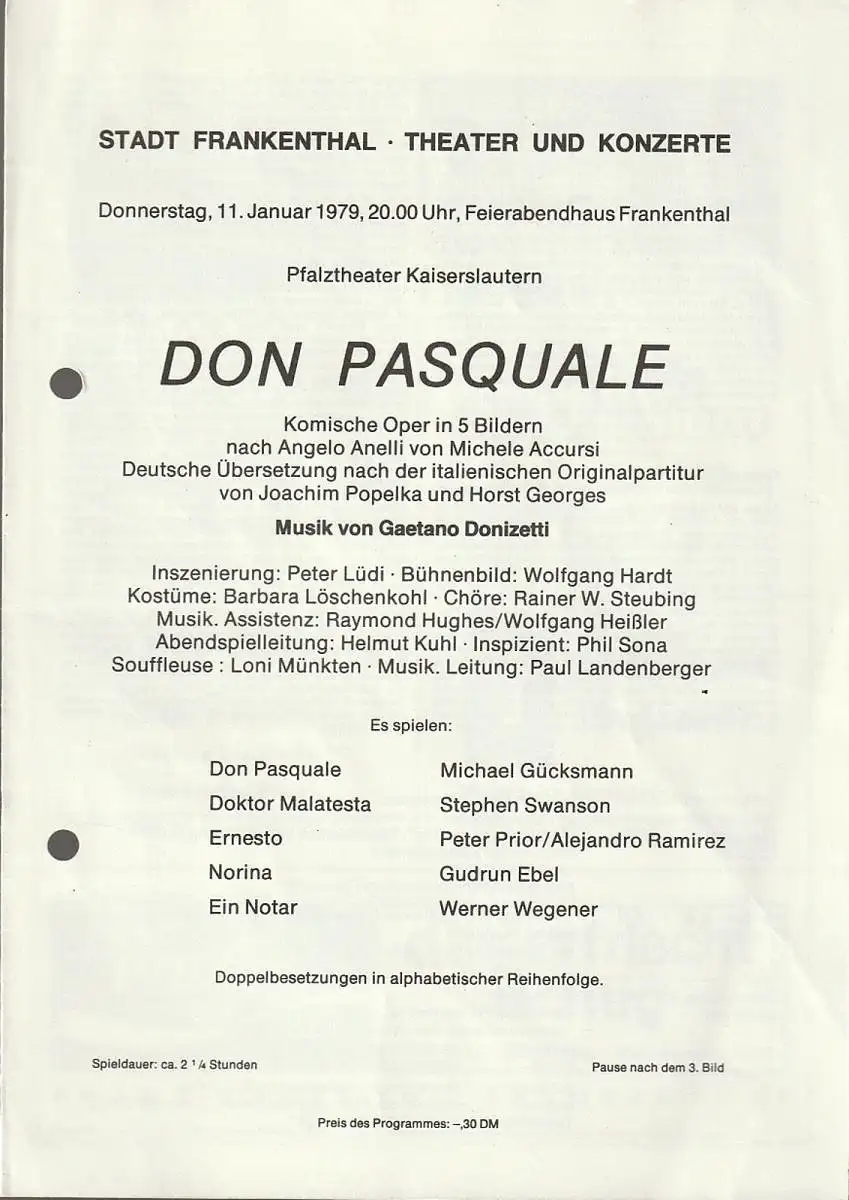Stadt Frankenthal, Theater und Konzerte, Feierabendhaus Frankenthal: Programmheft Gaetano Donizetti DON PASQUALE 11. Januar 1979 Feierabendhaus Frankenthal.