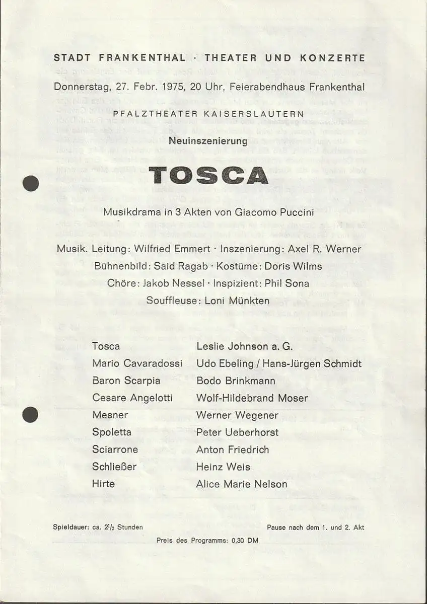 Titel: Programmheft Giacomo Puccini TOSCA 27. Februar 1975 Feierabendhaus Frankenthal