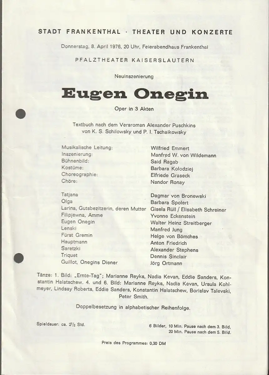 Stadt Frankenthal, Theater und Konzerte, Feierabendhaus Frankenthal: Programmheft Peter I. Tschaikowsky EUGEN ONEGIN 8. April 1976 Feierabendhaus Frankenthal.