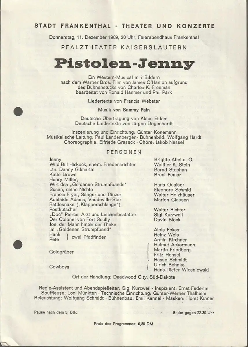 Titel: Programmheft Sammy Fain PISTOLEN-JENNY 11. Dezember 1969 Feierabendhaus Frankenthal