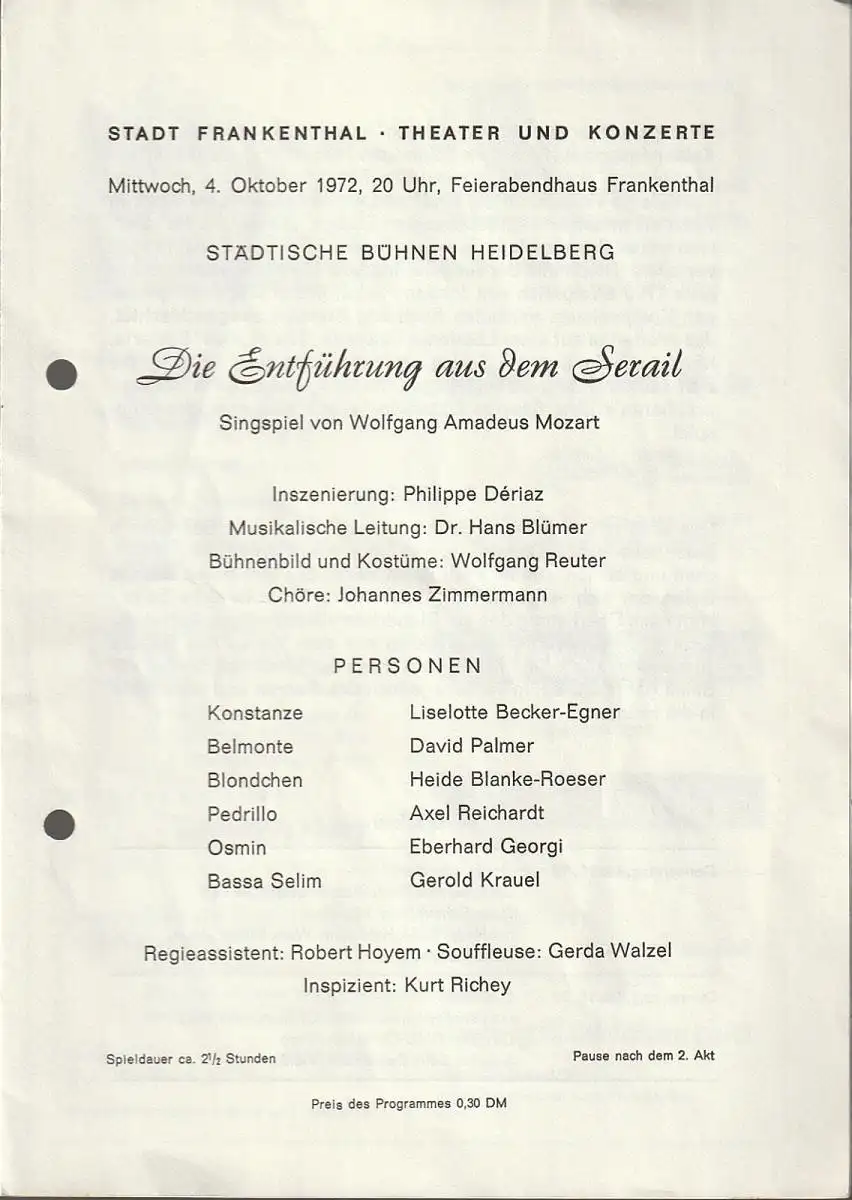 Stadt Frankenthal, Theater und Konzerte, Feierabendhaus Frankenthal: Programmheft Wolfgang Amadeus Mozart DIE ENTFÜHRUNG AUS DEM SERAIL 4. Oktober 1972 Feierabendhaus Frankenthal.