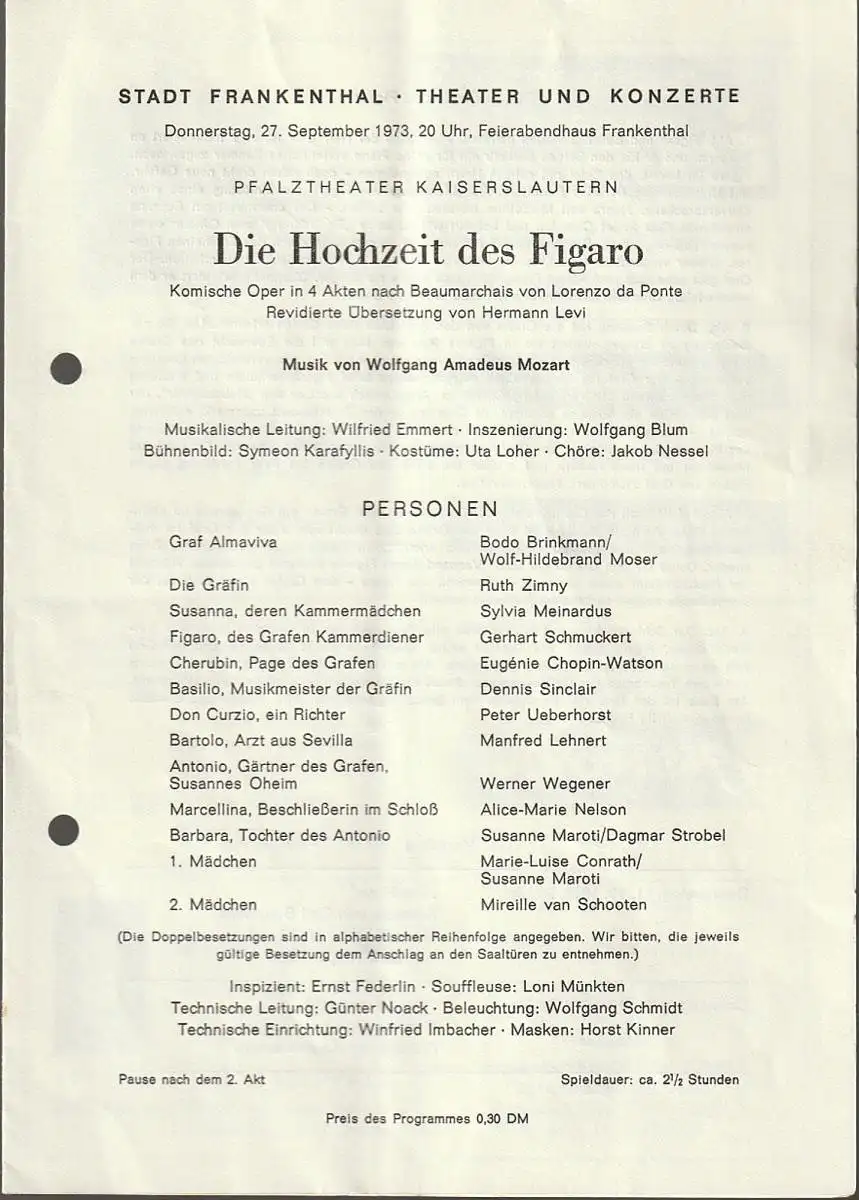 Titel: Programmheft Wolfgang Amadeus Mozart DIE HOCHZEIT DES FIGARO 27. September 1973 Feierabendhaus Frankenthal