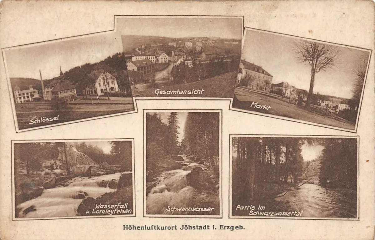 Stadtansicht, Markt u. Schlössel in Jöhstadt im Erzgebirge Sachsen Postkarte AK