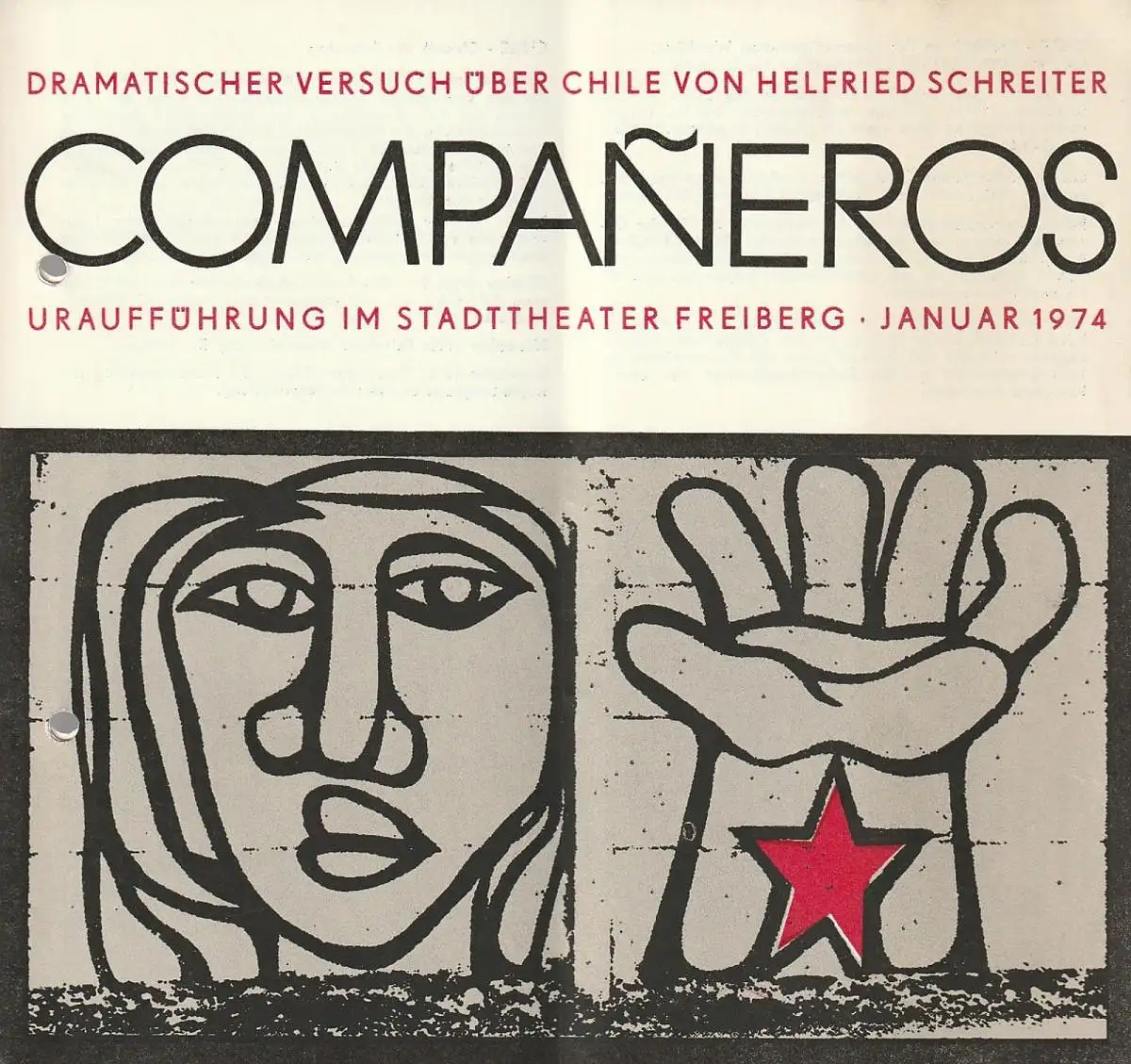 Dramatischer Versuch über Chile. Regie: Helfried Schreiter. Mitarbeit: Brigitte Brosche, Uta Kaulfuß, Manfred Richter, Ingrid Schwienke. Bühne: Eberhard Gerschler. Kostüme: Ingrid Gerschler. Musik: Hans Otto. Choreographie: Anita Richter. Mitwirkende: Werner Süßner, Eva Brose, Manfred Richter, Theo Richtsteiger, H.-Geirg Pührer, Ruth Bauer, Ines Kramer, Rolf Staude, u.a. - Theaterprogramm, Opernprogramm, Ballettprogramm, Musicalprogramm, Konzertprogramm, Theatermemorabilia, Programmhefte Sammlung, deutsche Theatergeschichte.