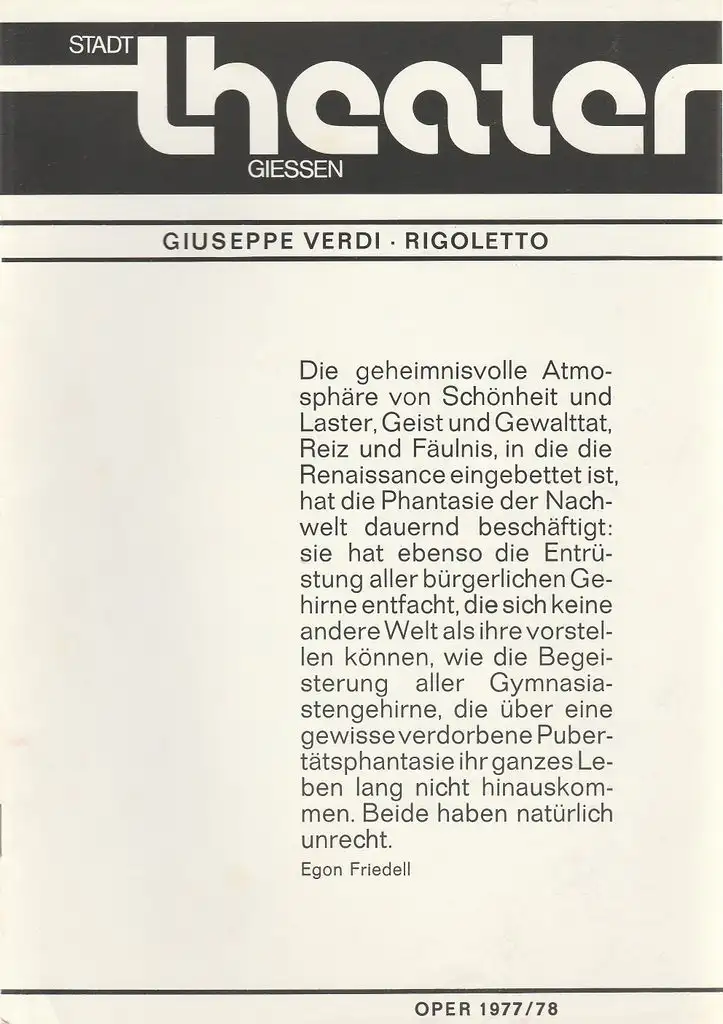 Stadttheater Giessen, Dietrich Taube, Frank-Thomas Mende, Jürgen Aue, Frank-Bernd Gottschalk: Programmheft Giuseppe Verdi RIGOLETTO Premiere 5. Februar 1978 Spielzeit Oper 1977 / 78 Heft 9.