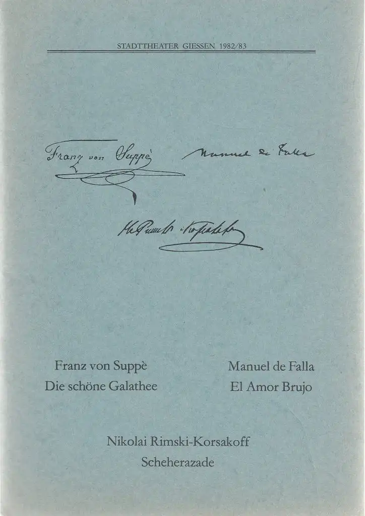 DIE SCHÖNE GALATHEE: Komisch mythologische Oper in einem Akt. Musikalische Leitung: Herbert Gietzen. Inszenierung: Wolfgang Lachnitt. Ausstattung: Vasitti Magnus. Mitwirkende: Hildegard Berkenhoff, Erwin Stephan, Wolfgang Stein, Horst Weber. EL AMOR BRUJO: ( Der Liebeszauber ) Ballett in einem Akt. Musikalische Leitung: Herbert Gietzen. Inszenierung und Choreographie: Rene Pegliasco. Ausstattung: Vasitti Magnus. Mitwirkende: Roman Kurniczak, Christine Pelz, Zbigniew Krasnopolski, Andra Lapossy, u. a. SCHEHERAZADE:Ballett in einem Akt. Musikalische Leitung: Herbert Gietzen. Inszenierung und Choreographie: Rene Pegliasco. Ausstattung: Vasitti Magnus. Mitwirkende: Rene Pegliasco, Roman Kurniczak, Zbigniew Krasnopolski, Paul Przybylski, Christine Pelz, Mary Bernet, Kirsten Schick, u. a. - Theaterprogramm, Opernprogramm, Ballettprogramm, Musicalprogramm, Konzertprogramm, Theatermemorabilia, Programmhefte Sammlung, deutsche Theatergeschichte.
