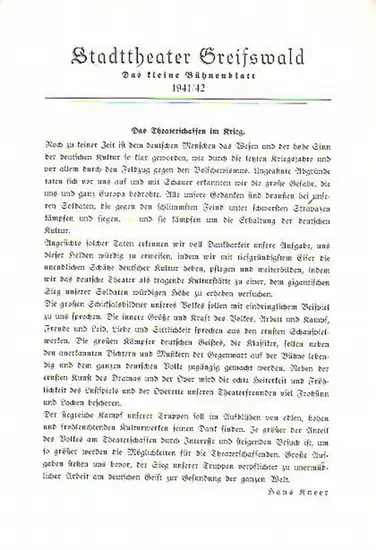 Stadttheater Greifswald - R.Keßler / Koch (Int.) / Kneer (Hrsg.): Stadttheater Greifswald - Das kleine Bühnenblatt 1941 / 1942 Präsentiert das Musikalische Lustspiel "Die Frau ohne Kuß". Herausgegeben von Dr.Claus Dietrich Koch und Hans Kneer.