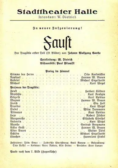 Stadttheater Halle - J.W.Goethe / Dietrich (Int.Regie) / Freiwald (Hrsg.): Stadttheater Halle - Faust Programm in neuer Inszenierung. Herausgegeben vom Intendant W.Dietrich und Dr.Curt Freiwald.