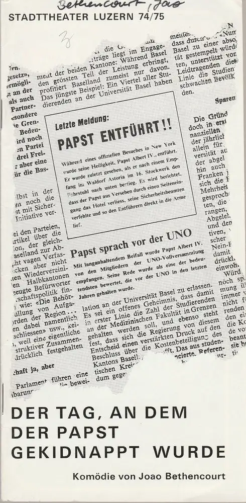 Stadttheater Luzern, Ulrich Meyer, Dieter E. Neuhaus: Programmheft DER TAG, AN DEM DER PAPST GEKIDNAPPT WURDE Premiere 29. April 1975 Spielzeit 1974 / 75.