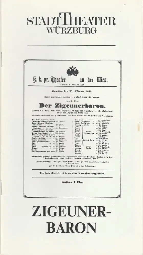 Stadttheater Würzburg, Achim Thorwald, Rainer Wahl: Programmheft Johann Strauß DER ZIGEUNERBARON Premiere 19. November 1987.