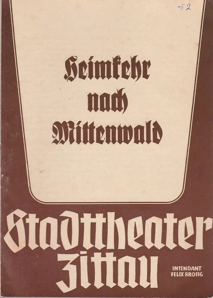 Stadttheater Zittau, Felix Brosig, Hubertus Methe: Programmheft Ludwig Schmidseder HEIMKEHR NACH MITTENWALD 1952.
