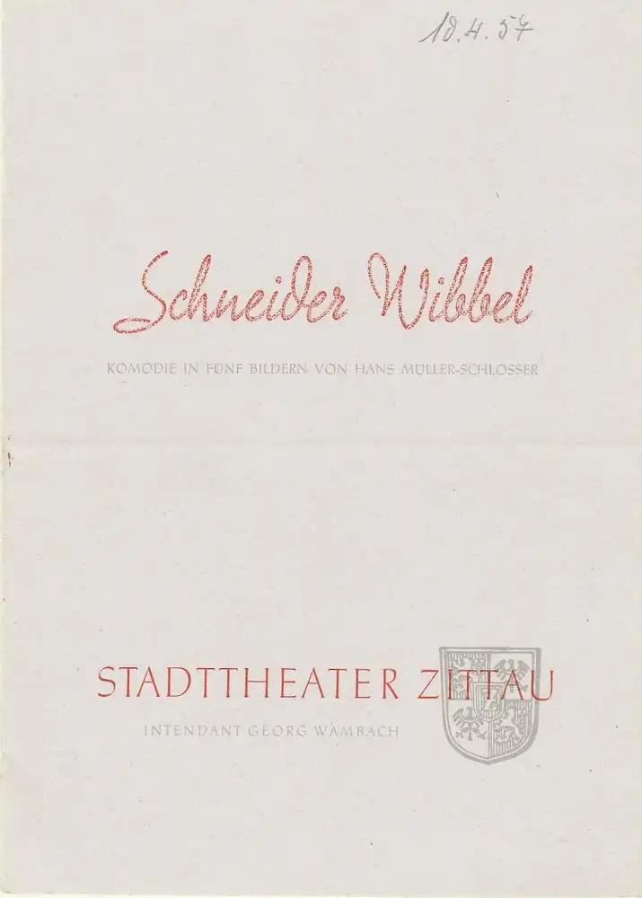 Stadttheater Zittau, Georg Wambach, Hubertus Methe: Programmheft Hans Müller-Schlösser SCHNEIDER WIBBEL Spielzeit 1956 / 57 Heft 13.