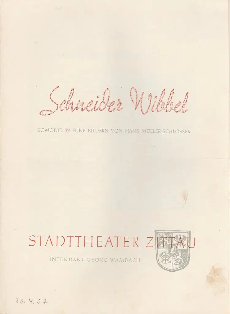 Stadttheater Zittau, Georg Wambach, Hubertus Methe: Programmheft Hans Müller-Schlösser SCHNEIDER WIBBEL Spielzeit 1956 / 57 Heft 13.