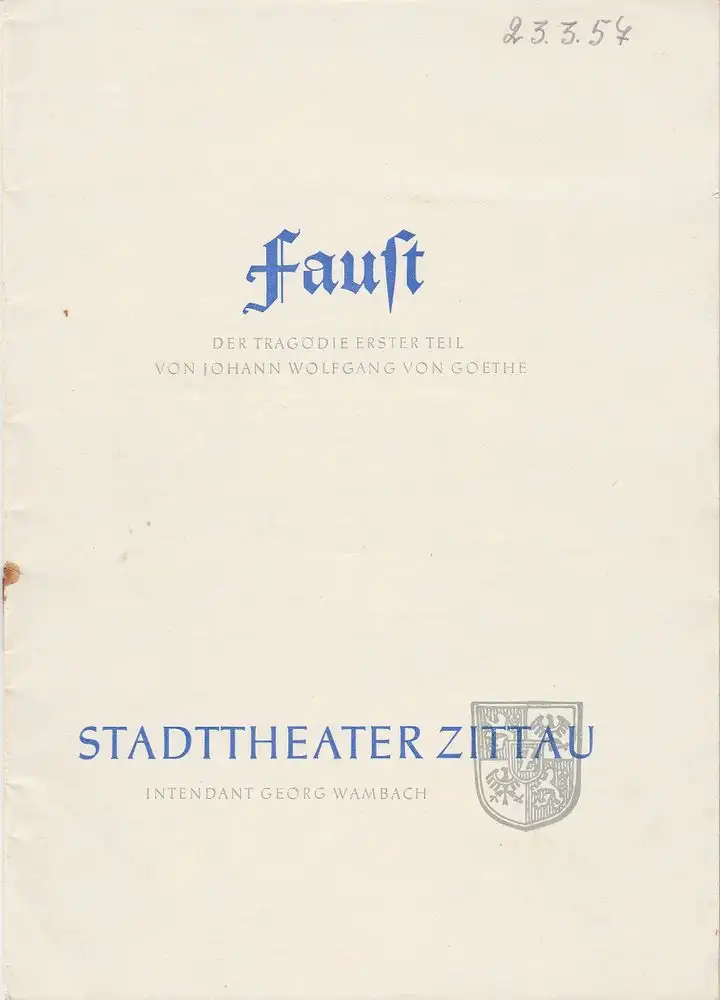 Stadttheater Zittau, Georg Wambach, Hubertus Methe: Programmheft Johann Wolfgang von Goethe FAUST 1957.
