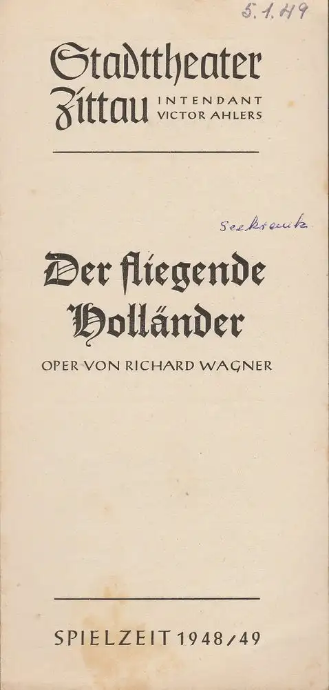 Stadttheater Zittau, Victor Ahlers, Dietrich Wolf: Programmheft Richard Wagner DER FLIEGENDE HOLLÄNDER Spielzeit 1948 / 49.