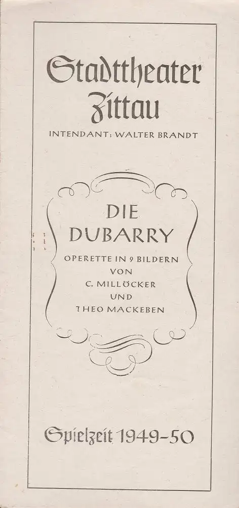 Stadttheater Zittau, Walter Brandt, Dietrich Wolf: Programmheft C. Millöcker und Theo Mackeben DIE DUBARRY Spielzeit 1949 / 50.