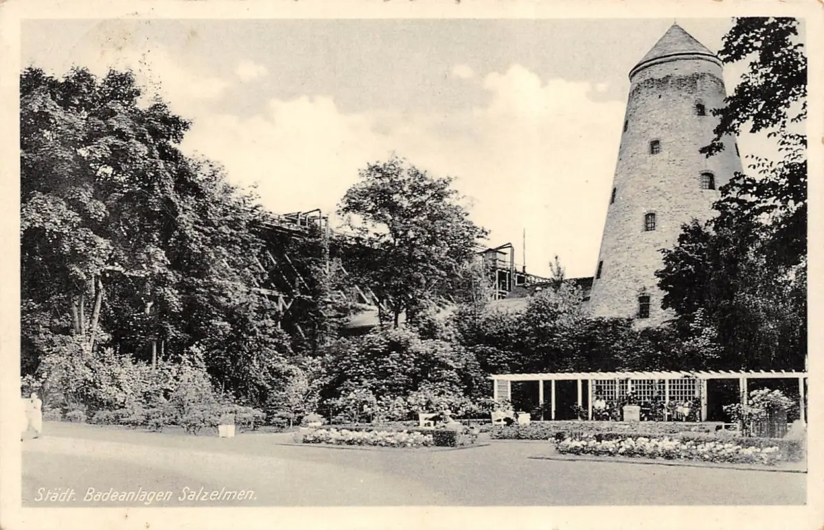 Städt. Badeanlagen Salzelmen Partie am Soleturm Postkarte AK 1941