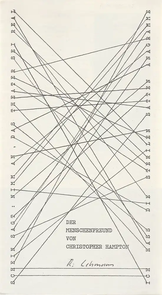 Bürgerliche Komödie. Deutsch von Martin Walser. Regie: Hans Dieter Lehmann. Bühne und Kostüme: Konrad Kulke. Mitwirkende: Jürgen Stößinger, Peter Hackenberger, Christian Seiler, Ariane Roggen, Dieter Goertz, Rosemarie Hees, Gabriele Kloske. - Theaterprogramm, Opernprogramm, Ballettprogramm, Musicalprogramm, Konzertprogramm, Theatermemorabilia, Programmhefte Sammlung, deutsche Theatergeschichte.