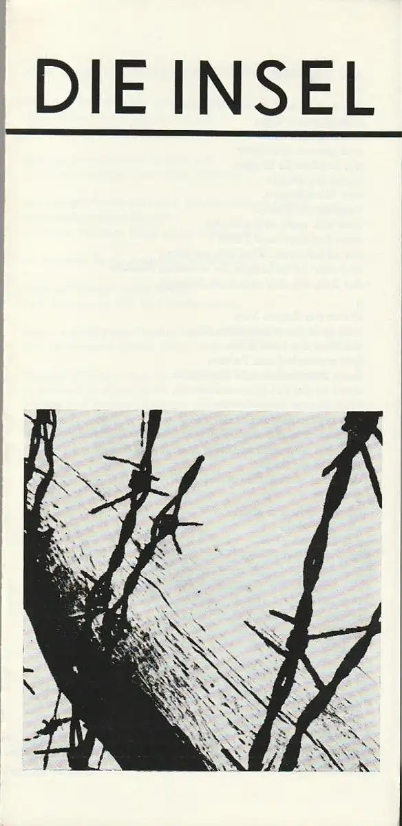 THE ISLAND von Athol Fugard, John Kani und Winston Ntshona. Aus dem Englischen von Eva Walch. Inszenierung: Ekkehard Emig, Harald Richter. Ausstattung: Christian Schott. Mitwirkende: Roland May, Herbert Wegner - Theaterprogramm, Opernprogramm, Ballettprogramm, Musicalprogramm, Konzertprogramm, Theatermemorabilia, Programmhefte Sammlung, deutsche Theatergeschichte.