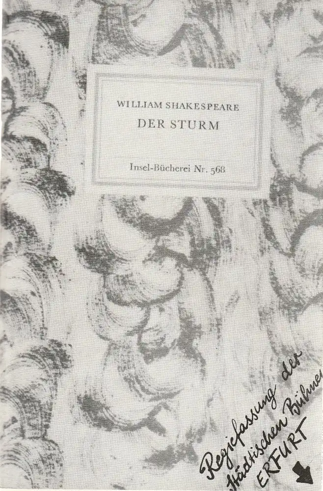 The Tempest. Auf das Original zurückgreifende Spielfassung der Städtischen Bühnen Erfurt unter weitgehender Verwendung der Übersetzung von August Wilhelm Schlegel. Musik: Ulrich Hermann. Regie: Ekkehard Kiesewetter. Bühnenbild: Frank Hänig. Kostüme: Waltraud Moser. Musikalische Leitung: Ulrich Hermann. Mitwirkende: Hanns-Michael Schmidt, Reinhard Friedrich, Karl-Heinz Krause, Wolf-Dietrich Köllner, Gabriele Streichhahn, u. a. - Theaterprogramm, Opernprogramm, Ballettprogramm, Musicalprogramm, Konzertprogramm, Theatermemorabilia, Programmhefte Sammlung, deutsche Theatergeschichte.