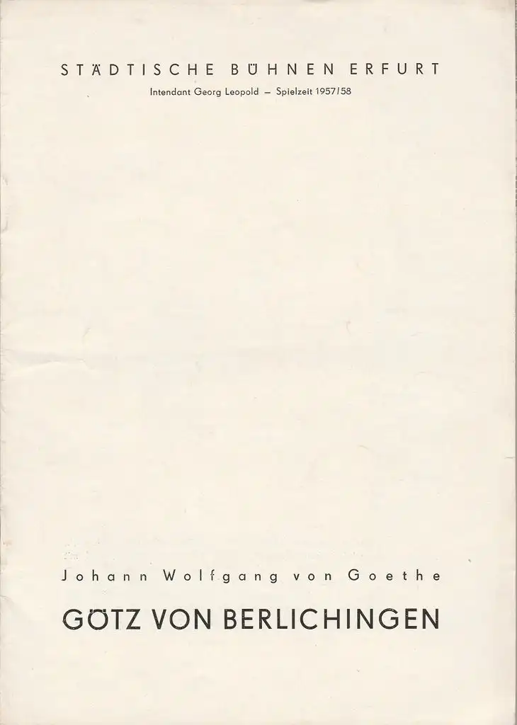 Städtische Bühnen Erfurt, Georg Leopold, Hans Welker: Programmheft Johann Wolfgang von Goethe GÖTZ VON BERLICHINGEN Premiere 24. Mai 1958 Spielzeit 1957 / 58.