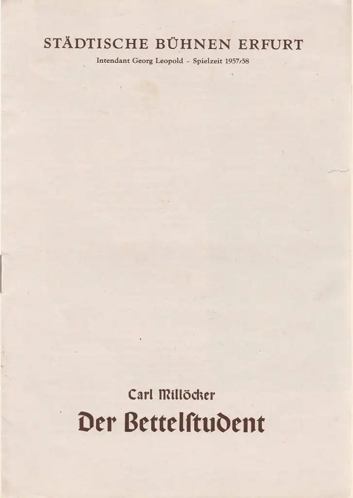 Städtische Bühnen Erfurt, Georg Leopold, Walter Hardtmann, Margret Müller: Programmheft Carl Millöcker DER BETTELSTUDENT Premiere 19. Oktober 1957 Blätter der Städtischen Bühnen Erfurt Spielzeit 1957 / 58 Heft 6.