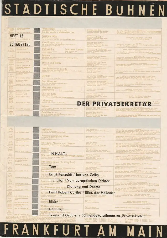 Städtische Bühnen Frankfurt am Main, Harry Buckwitz, Günter Skopnik, Rudi Seitz: Programmheft DER PRIVATSEKRETÄR. Komödie von T.S. Eliot Premiere 15. Mai 1959 Kleines Haus im Börsensaal Spielzeit 1958 / 59 Schauspiel Heft 12.