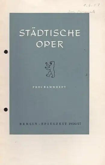 Titel: Programmheft. Spielzeit 1956 / 1957. Mit Besetzungsliste zu: Don Pasquale. Musikalische Leitung: Wolfgang Martin / Inszenierung: Wolf Völker / Bühnenbild und Kostüme: Robert Pudlich / Darsteller: u. a. Fritz Hoppe, Herbert Brauer, Heinz Hoppe, Sari Barabas, Leopold Clam