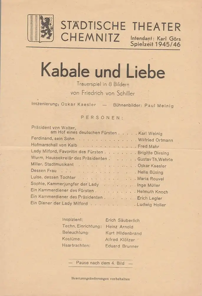 Städtische Theater Chemnitz, Karl Görs: Theaterzettel Friedrich von Schiller KABALE UND LIEBE Spielzeit 1945 / 46.
