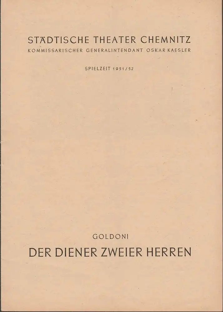 Städtische Theater Chemnitz, Oskar Kaesler (Kommissarischer Generalintendant), Hans Müller: Programmheft Carlo Goldoni DER DIENER ZWEIER HERREN Spielzeit 1951 / 52.