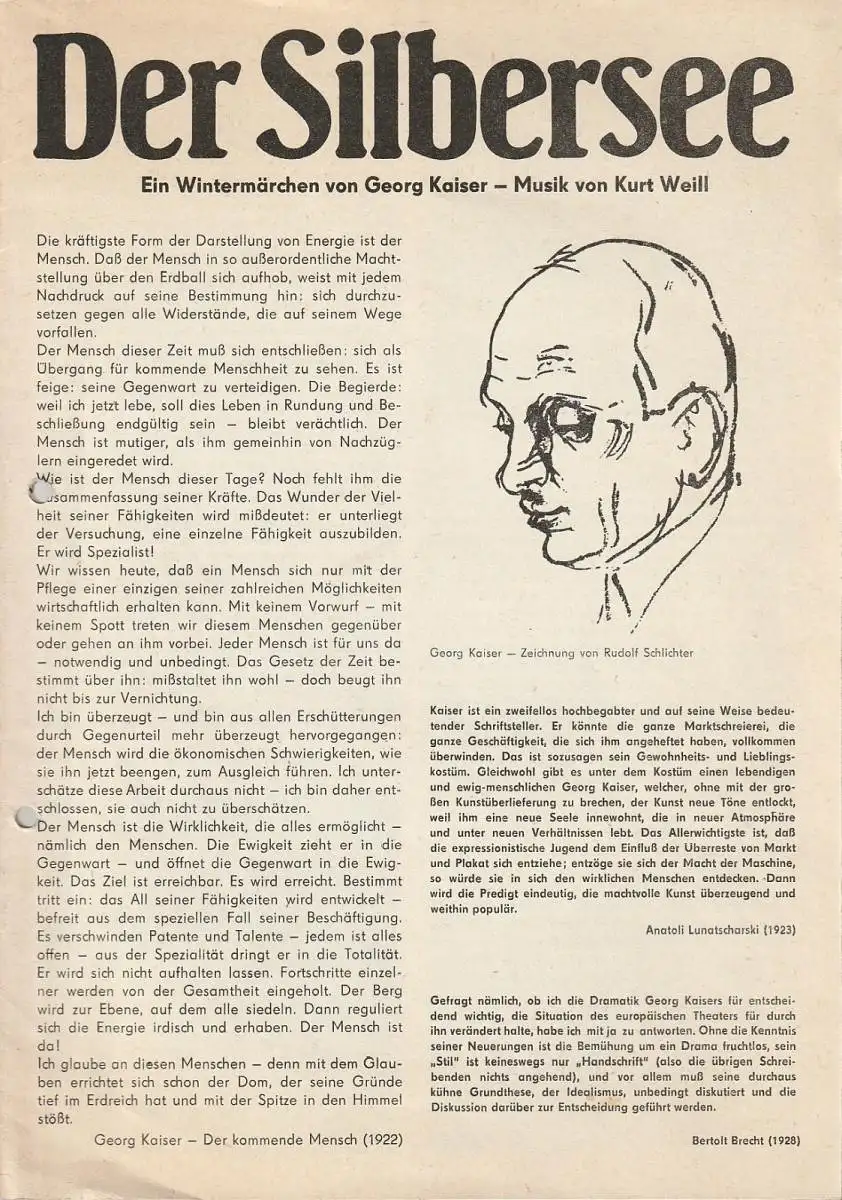 Städtische Theater Karl-Marx-Stadt, Gerhard Meyer, Manfred Patzschke, Florian Morgenstern: Programmheft Georg Kaiser / Kurt Weill DER SILBERSEE Premiere 5. Mai 1985 Spielzeit 1984 / 85.